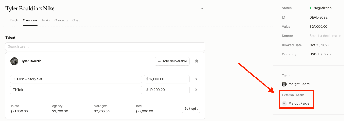 Can I assign the same external team member to multiple talents and deals? Yes — once created, an external team member can be assigned to as many talents and deals as needed.